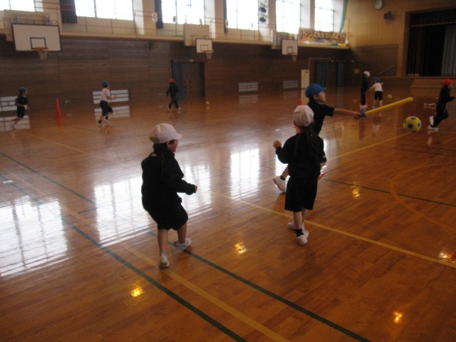 体ほぐしの運動です。三人一組となり、ボールをパスしたりじゃましたりしていろいろな動きを身に付けていました。