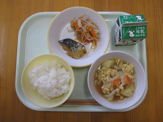 きょうの給食は、ごはん、牛乳、さばの味噌煮、野菜ソテー、卵とじです。