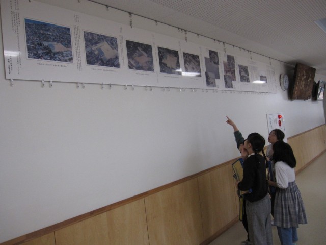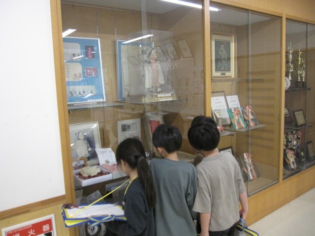 総合的な学習の時間では、学校や校区について調べます。校内にある掲示物などをじっくりと見ていました。