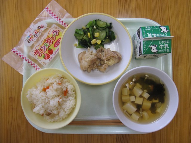 きょうの給食は、ちらしずし、牛乳、鶏肉のから揚げ、コーン和え、すまし汁、お祝いデザートです。入学お祝い献立でした。