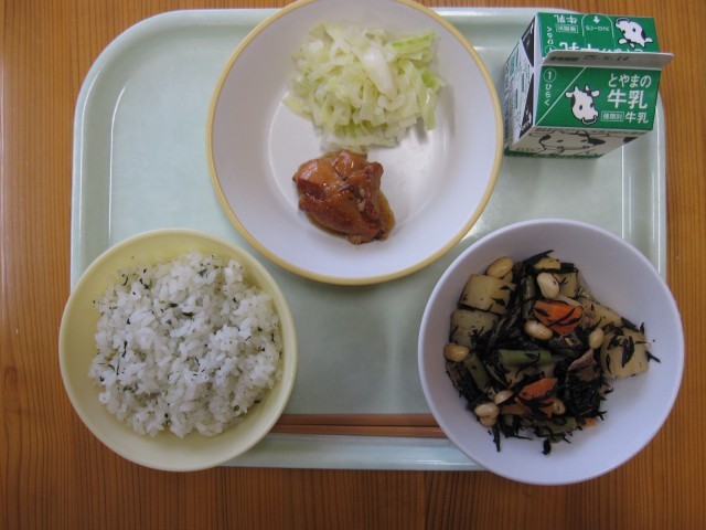 きょうの給食は、菜めし、牛乳、鶏肉の照り焼き、添え野菜、大豆の磯煮です。