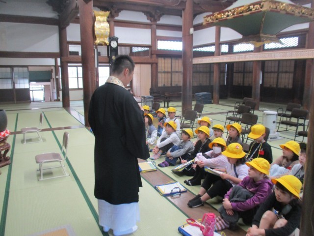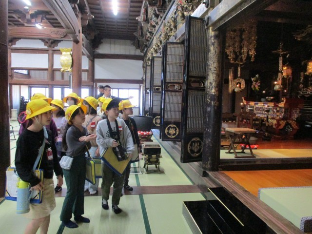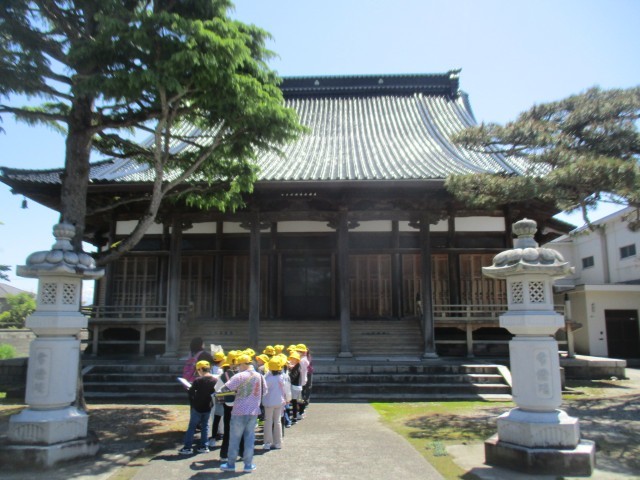 水橋中部小学校のまわりにある施設や交通の様子を調べるために町探検に出かけました。学校を出発してすぐに、学校の前の通りにあるお店を確かめたり、カフェの中を見せていただいたりしました。その後、神社や銀行があることを確かめながら、照蓮寺まで歩き、本堂で住職さんからお話を聞きました。照蓮寺が長い歴史のあるお寺ということや「水橋」という地名が昔からつかわれていたことなど、たくさんのことを教えていただきました。今日の探検で分かったことは、社会の時間に地図にまとめます。総合の学習では、これからも水橋中部の「すてき」を見つけていきます。