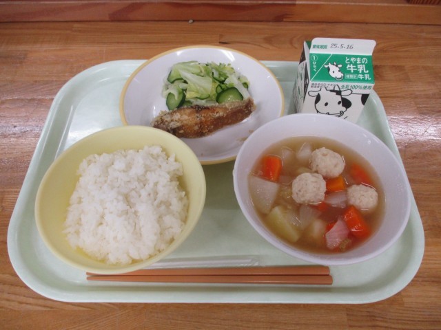 今日の給食は、ごはん、牛乳、あじのから揚げ、きざみ和え、和風ポトフです。
