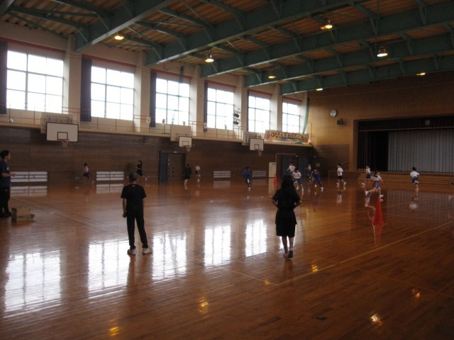 体育の時間のはじめです。腰にタグをつけておにごっこのように体育館中を走り回っていました。