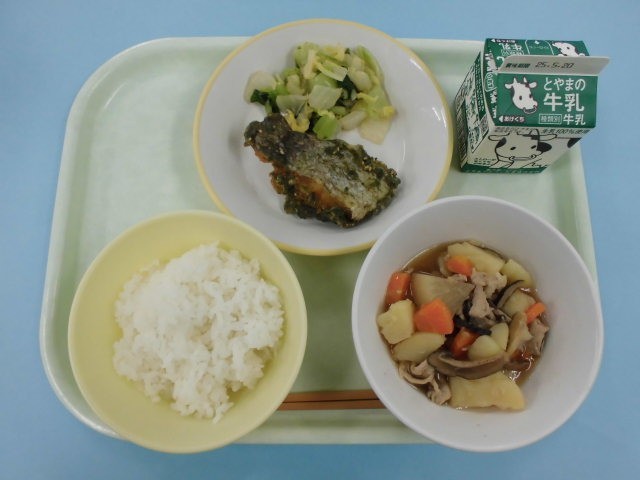 今日の給食は、ごはん、牛乳、ホキの磯辺揚げ、しょうがひたし、大和煮です。