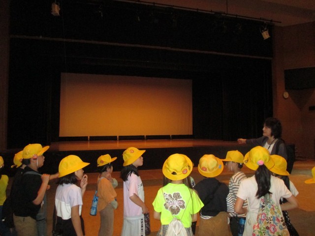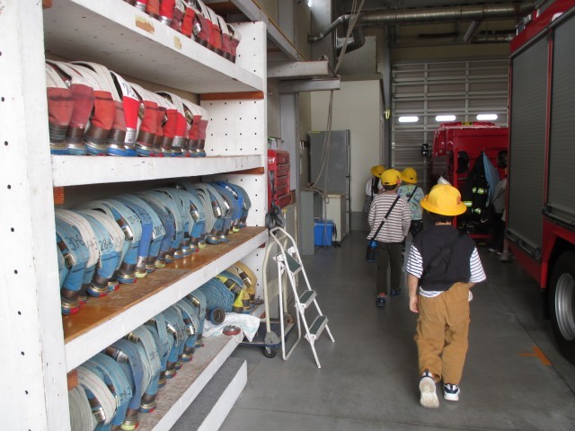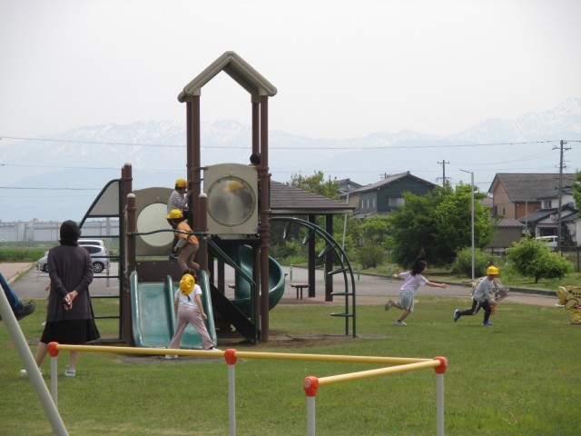 「水橋中部のキラキラを見つけよう」と町探検に出かけました。水橋消防署で消防自動車を見学したり、ふるさと会館でホールを見たりしました。最後は東公園に行き、お気に入りの遊具で遊びました。