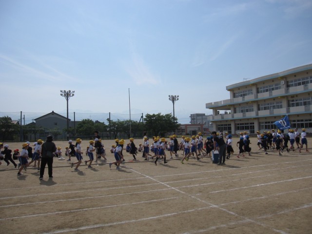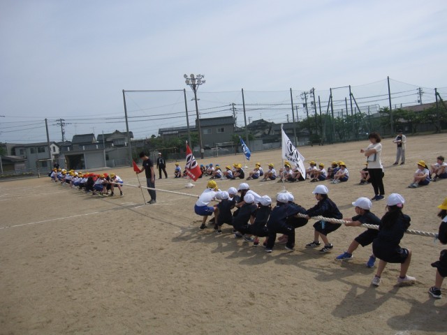 今年の運動会の綱引きは全児童で行います。三つの団で勝ち数を競います。きょうの練習はスムーズに進み、実際に綱を引く練習もできました。はたして本番はどこが勝つでしょう。