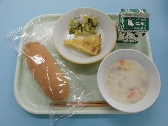 今日の給食は、コッペパン、牛乳、スパニッシュオムレツ、コーンサラダ、クリームスープです。