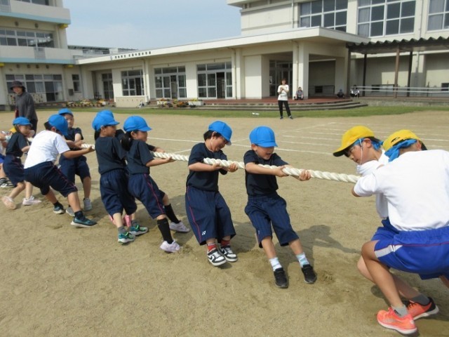 全校綱引き、がんばるぞ(1、2年生)