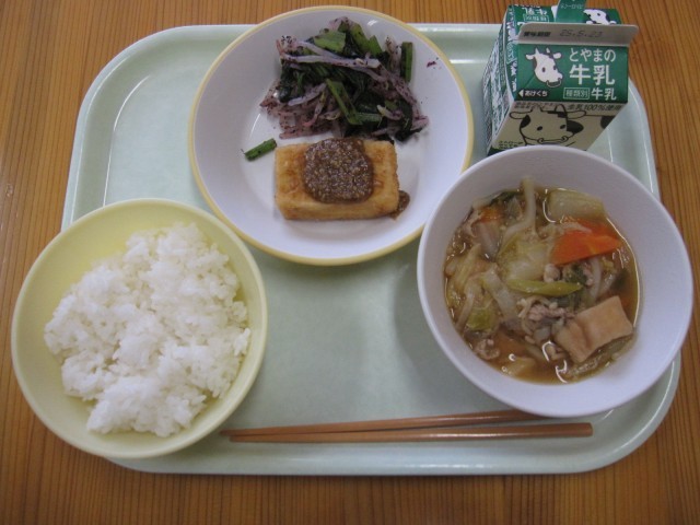 きょうの給食は、ごはん、牛乳、揚げ出し豆腐のごまだれかけ、ゆかりあえ、すき焼きです。