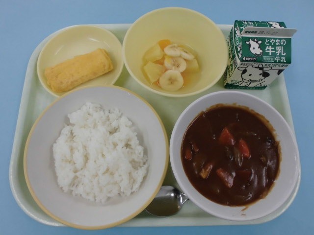 今日の給食は、ごはん、牛乳、たべキリンハヤシ、卵ロール、フルーツミックスです。