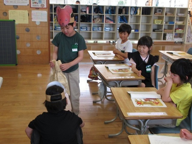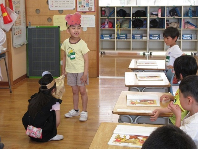国語科「はなのみち」の学習で、袋に穴が開いていたことが分かったくまさんの気持ちになって、役割演技をしました。残念そうな声で袋を見つめたり、穴を見付けてくまさんに教えるりすさんになったりして、子供たちはそれぞれ工夫して演じていました。気持ちを表す言葉を少しずつ増やしていると感じました。
