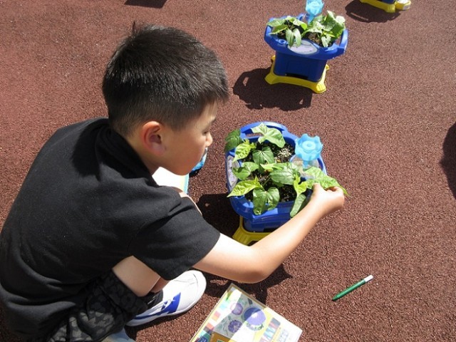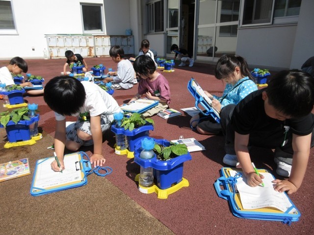 明るい日差しの中、あさがおの世話をしていた子供たちが、「葉っぱが7枚になった!」「葉っぱがすごく大きくなった!」「葉っぱの色が変わってきた!」とうれしそうに声を上げていました。自分の手のひらの大きさと比べたり、双葉と本葉の手触りを確かめたりして、発見がどんどん増えてきたので、「あさがお日記」をかくことにしました。あさがおの成長が、毎朝の楽しみになっています。