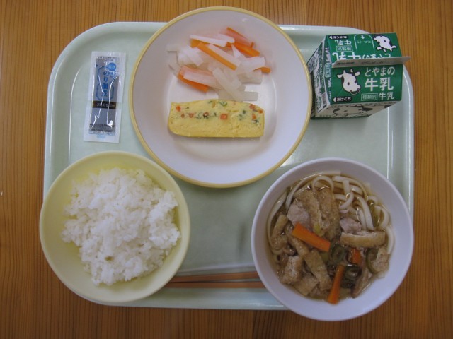 きょうの給食は、ごはん、牛乳、千草焼き、なます、かやくうどん、のり佃煮です。