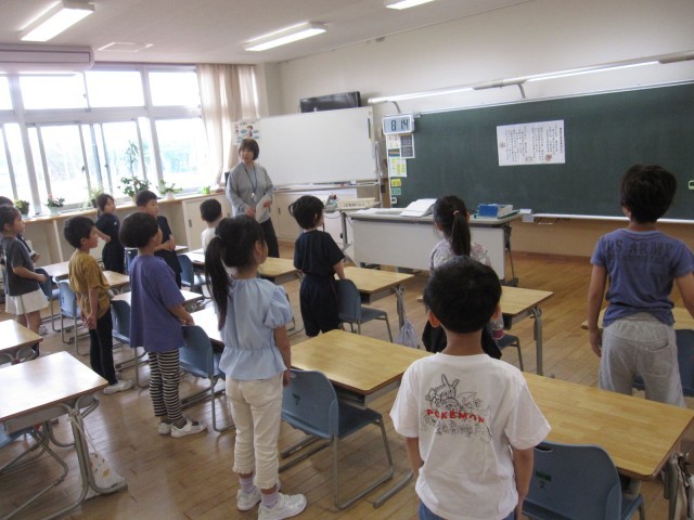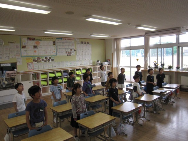 朝の会が始まると、今月の歌「花束をあなたに」の歌声が聞こえてきました。健康観察では、"I'm fine.” "I'm happy." など英語で返事をしていました。