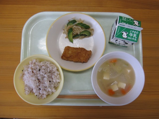 きょうの給食は、雑穀いりごはん、牛乳、いかフライ、かふう和え、すいとんです。きょうは「かみかみ献立」でした。