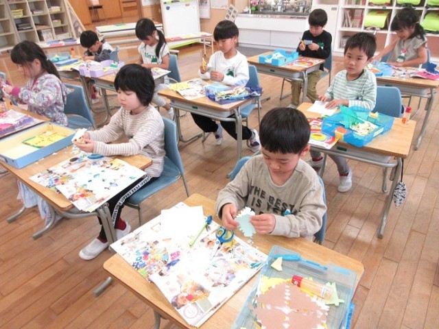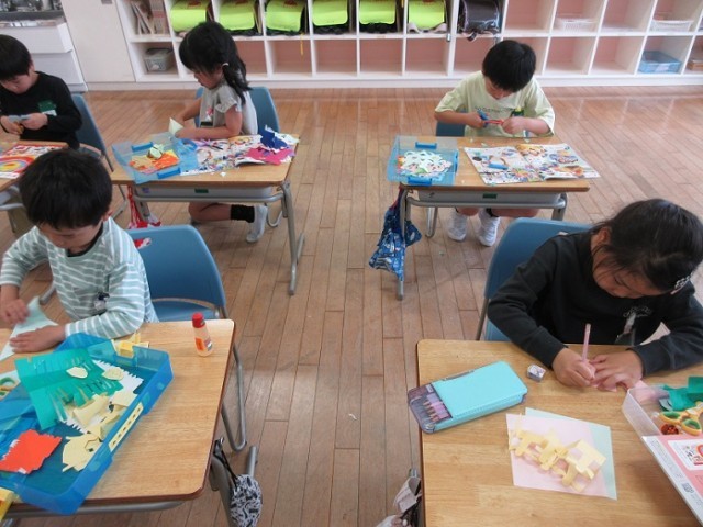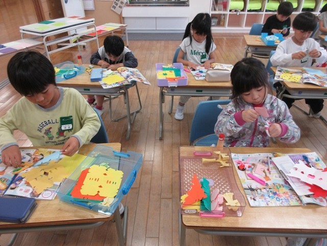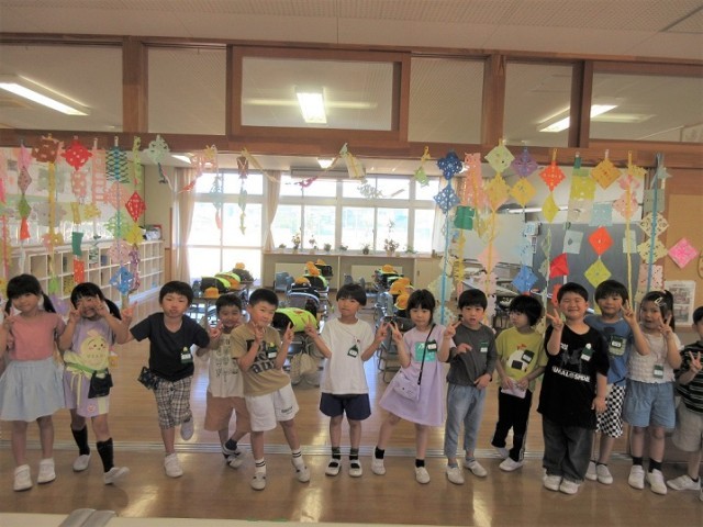 自分で色や折り方、切り込み方を工夫して飾りをつくりました。細かく切り込む子、切り取った後の形を予想してつくる子、色紙を重ねて色の組み合わせを楽しむ子など、いろいろな思いで作品を仕上げました。教室の入り口に飾ると、七夕のように賑やかになり、思わず笑顔になっていました。