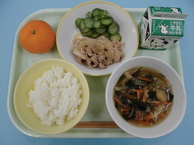 今日の給食は、ごはん、牛乳、豚肉のジャンロー、きゅうりもみ、沢煮椀、冷凍みかんです。