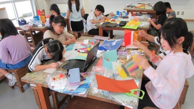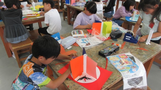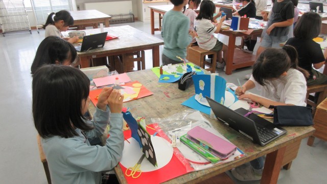 図画工作科で「動いて楽しいわりピンワールド」を製作しています。回転させて動くようにしたり、部屋が変わったりするようにしたりして工夫して取り組んでいました。