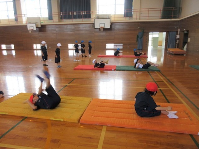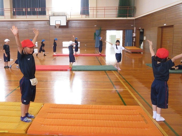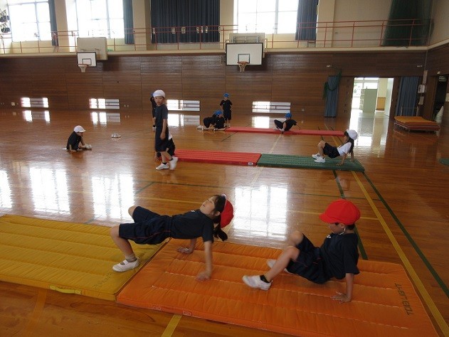 子供たちは各団で協力してマットの準備をし、いろいろな動きに挑戦しました。クマさん歩き、カエル跳び、クモ歩き…等、友達同士で声をかけながら楽しく活動しました。最後に胸を張ってポーズを取るときは、誇らしげな表情でした。