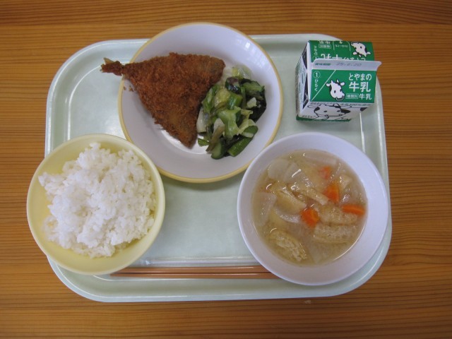 きょうの給食は、ごはん、牛乳、あじフライ、海藻サラダ、みそ汁です。