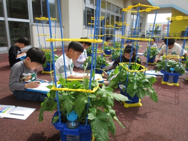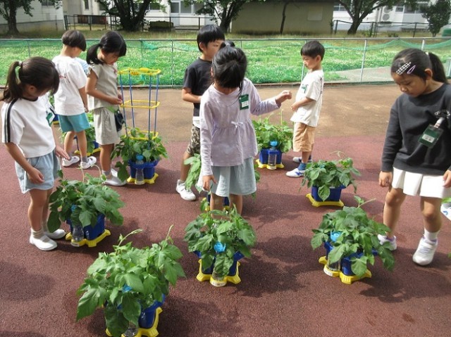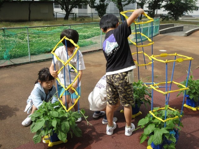 あさがおのつるが伸び、隣りのあさがおのつると絡まる様子が見られました。子供たちは、つるが伸びるとまっすぐに立てないことに気付き、支柱を立てることを提案しました。友達と協力し、あさがおの葉が傷つかないように支柱を立てました。1日前に支柱を立てた友達のつるが自然に巻き付いているのを見て、「目があるのかな?」「生きてるんだね」とあさがおの不思議を感じていました。