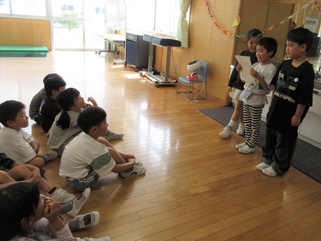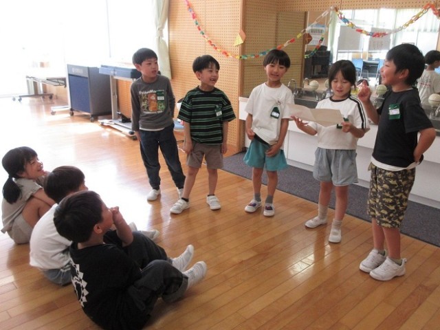 入学して2か月余り経ちました。子供たちは、係活動の一つとして誕生会の企画を立て、みんなで楽しい時間を過ごすことを目当てに準備を進めてきました。今日は、その本番です。しっかりと準備をしてきたので、どの係も堂々とプログラムを進めることができました。誕生者だけでなく、みんなが「楽しい!」とつぶやくすてきな集会になりました。