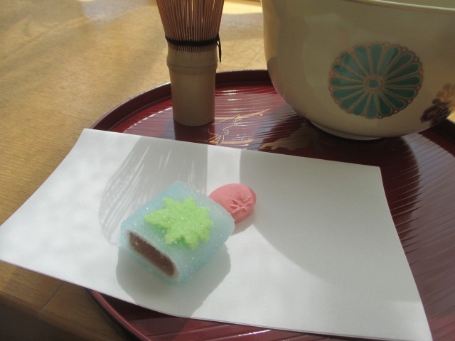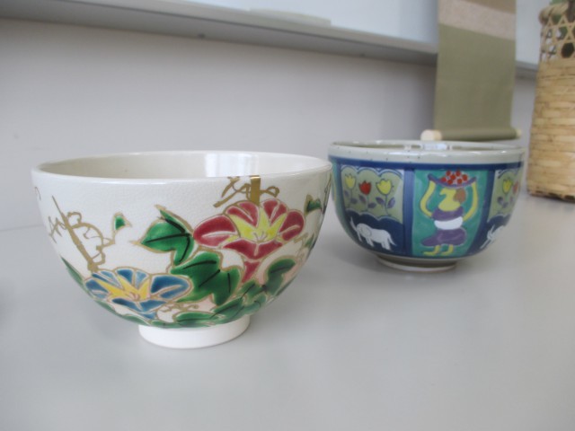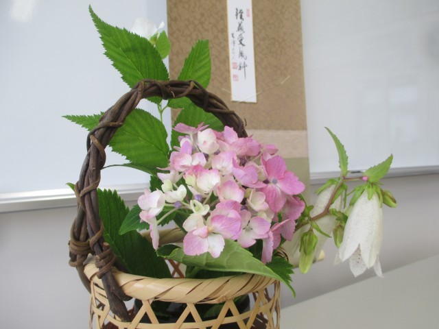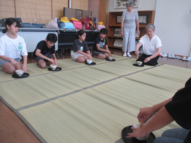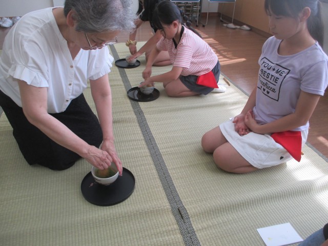 茶道クラブでは、6月の花「あじさい」等の花や「ツバメ」の掛け軸を飾り、それに合う茶碗を拝見しました。季節のお菓子をいただいてから、自分でお茶を点てました。今回、初めて自分で点てましたが、みんな上手にできました。