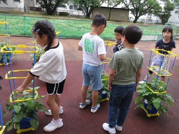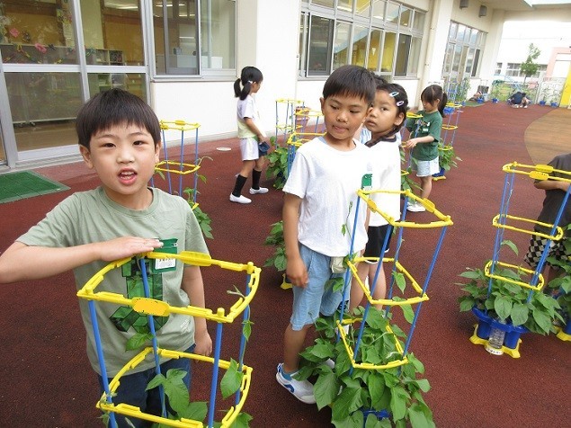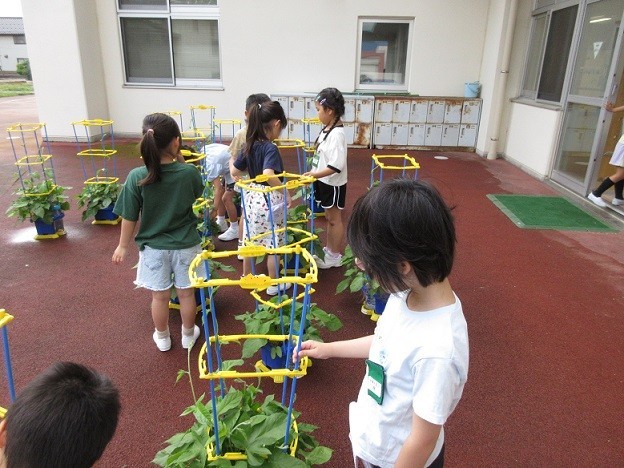 13日(金)に肥料をあげたうえに、土日の雨をあびたあさがおは、とても高くつるを伸ばしていました。子供たちは、自分と背比べをしたり、つるが自ら巻き付いていることに不思議を感じたりしながら、互いにつぶやいていました。「もうすぐ、支柱を超えちゃうよ」「もしかしたら、これはつぼみかも?」とあさがおの成長に胸躍らせています。