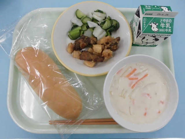 今日の給食は、米粉コッペパン、牛乳、鶏肉とレバーのりんごソースからめ、かぶのサラダ、ビーンズポタージュです。