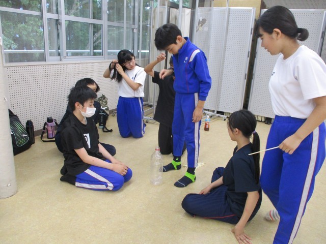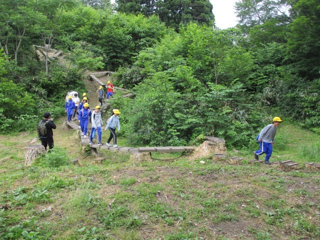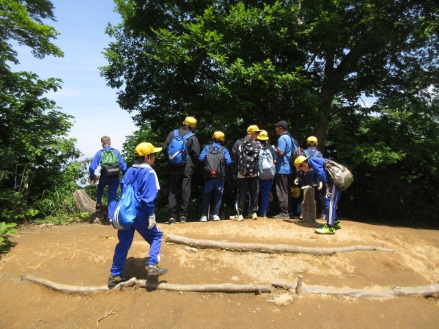 宿泊学習1日目の様子です。来拝山登山では、みんなで声をかけあい、頂上目指してがんばりました。暑さにも負けず、最後まで登り切った子供たちは達成感を味わっていました。