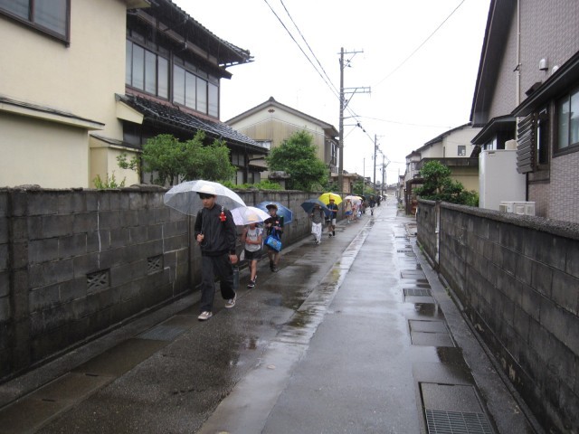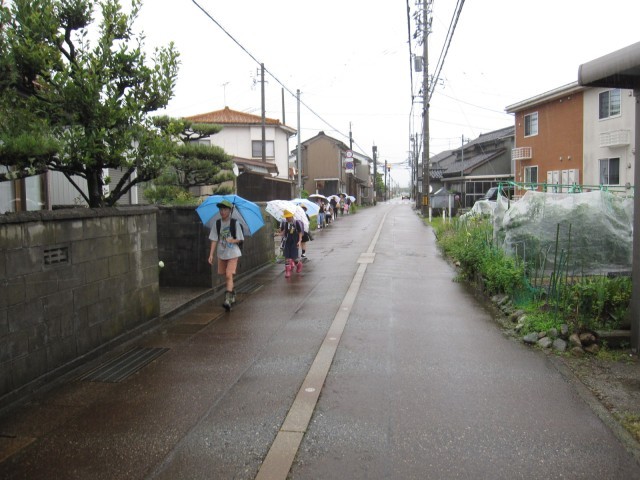 土・日曜日と猛暑日になる暑い日でしたが、今週は雨が続きそうです。かさを差して一列に並び元気に登校してきました。