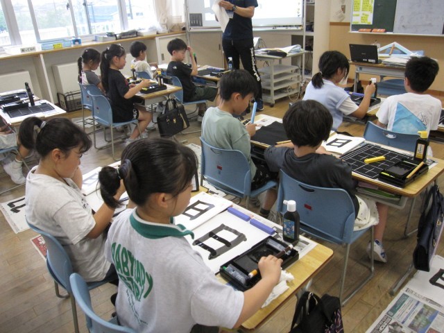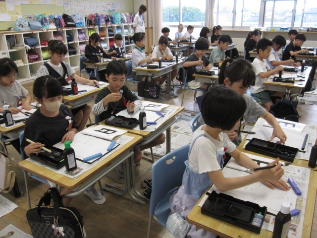 きょうの書写は「おれ」の筆づかいに気を付けて「日」の文字を書きます。3年生から始まった毛筆ですが、準備や後片付けも慣れてきました。