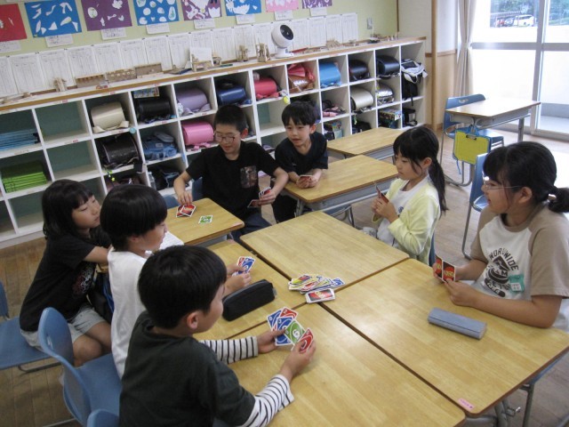 きょうの自主タイムは、5年生の企画によるファミリー活動です。ドッジボールやだるまさんがころんだ、カードゲームなどファミリーに分かれて楽しく遊びました。