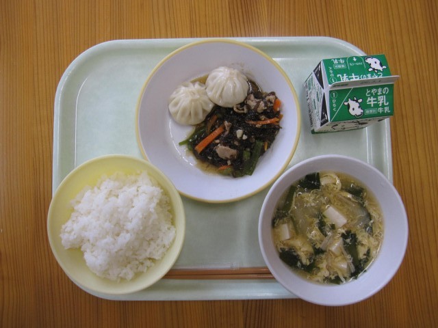 きょうの給食は、ごはん、牛乳、えびパオツ、もずくのチャプチェ、ニラ玉汁です。