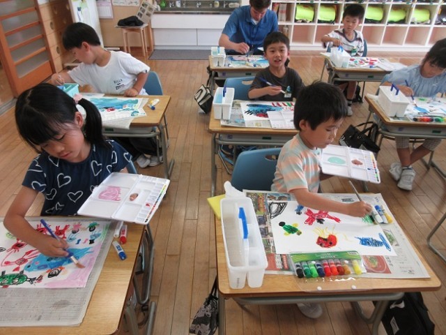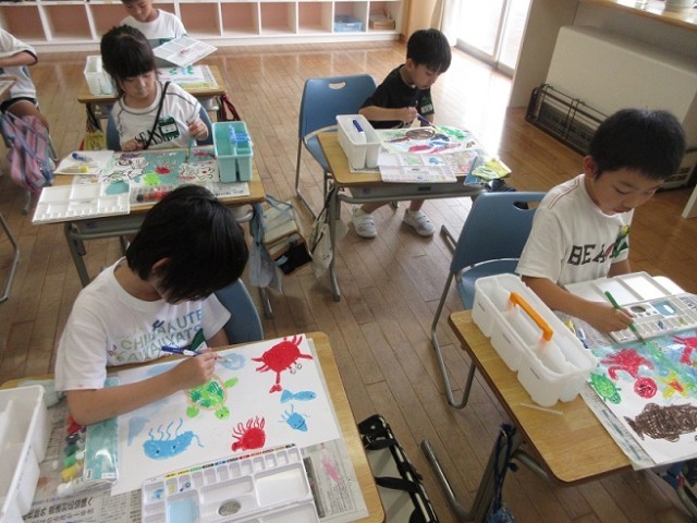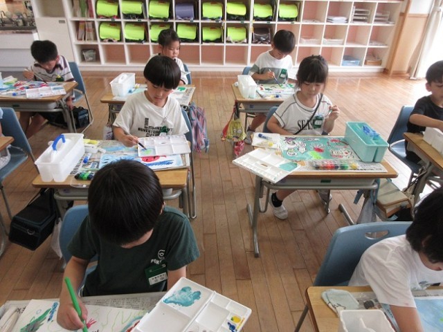 図画工作科「海の中にもぐってみたら・・・」の学習で、初めて水彩を使いました。まず、自分や海の中の生き物をクレヨンで描きました。それから、絵の具を3色選び、背景の色づくりをしました。海の中の色を表すために混ぜ方を工夫し、のびのびと描いていました。描き終わると、「あ~楽しかった」と満足げな様子の子供たちでした。