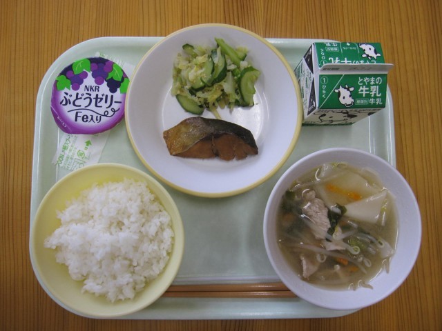 きょうの給食は、ごはん、あじのみりん焼き、合わせ和え、みそワンタンスープ、ぶどうゼリーです。