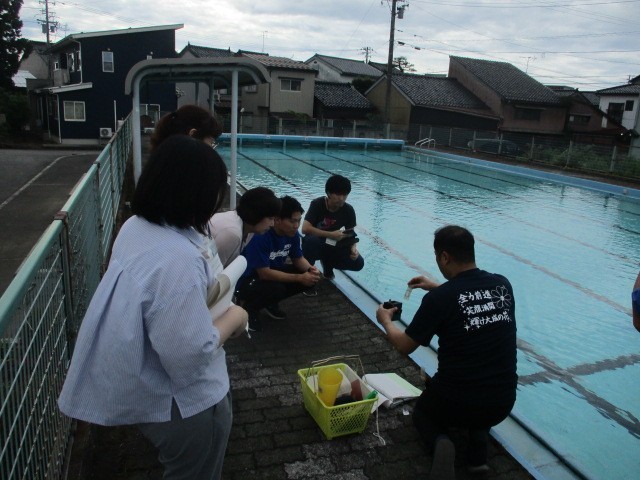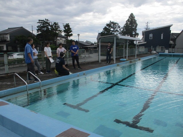 先生たちがプールの管理の仕方を確認しました。安全に水泳の学習が進められるよう万全を期します。