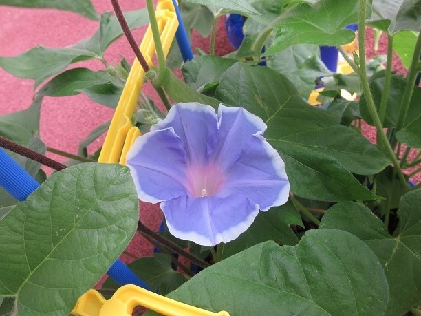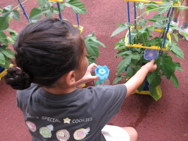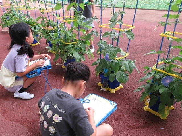 今週の雨は、あさがおのつるをぐんぐん伸ばし、つぼみを膨らませました。国語科「つぼみ」の学習で提示されていた「あさがおのつぼみ」の実物を見付けた子供たちは、「あったー!ねじねじだ。色も分かるよ!明日の朝に咲くのかな」と大興奮!さらに、「花が咲いてる!」と叫ぶ子供たち。数人の子供のあさがおが、1~2個の花を咲かせていました。記念の開花の様子を観察カードに記録しておこうと、自主的に描き、喜びを表しました。