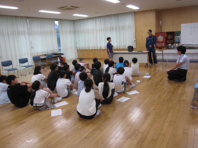 BFCバッジ授与式の後に防火教室が行われていました。119番通報訓練をしていました。「場所はどこですか」「運転していてけがをしている人は男性か、女性か、何歳ぐらいか・・・」など司令室からの質問に的確に答えていました。