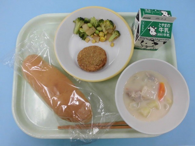 今日の給食は、コッペパン、牛乳、いわしメンチカツ、コロコロサラダ、クリーム煮です。
