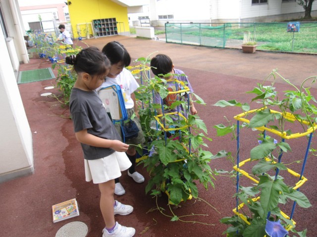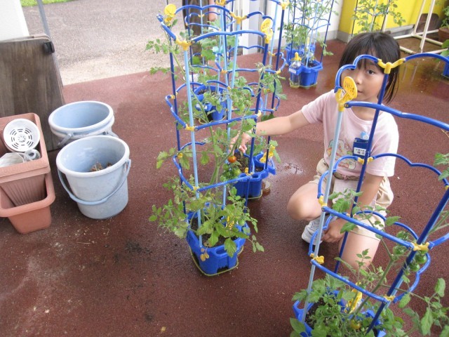 1年生が育てているアサガオに花が咲き始めました。2年生では、ミニトマトの実が重そうにいくつもなっています。