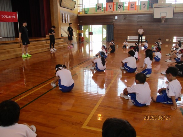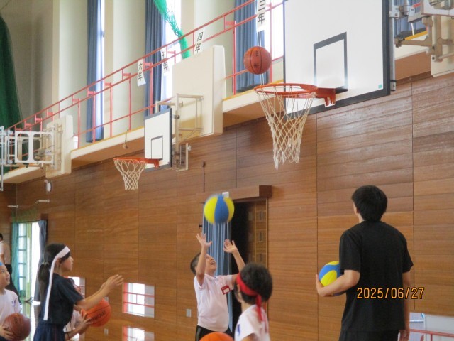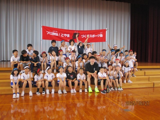 プロ直伝!とやま夢づくりスポーツ塾として、富山グラウジーズから野﨑選手と3名のアカデミーコーチの方々を講師としてお招きし、3,4年生がバスケットボールを教えていただきました。最後の野﨑選手との対戦ではプロの技を間近で体感することができ、貴重な経験となりました。富山グラウジーズの皆様ありがとうございました。