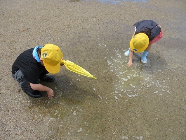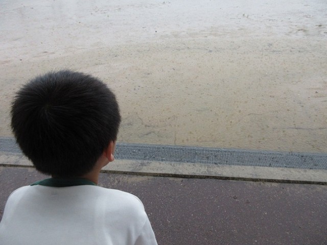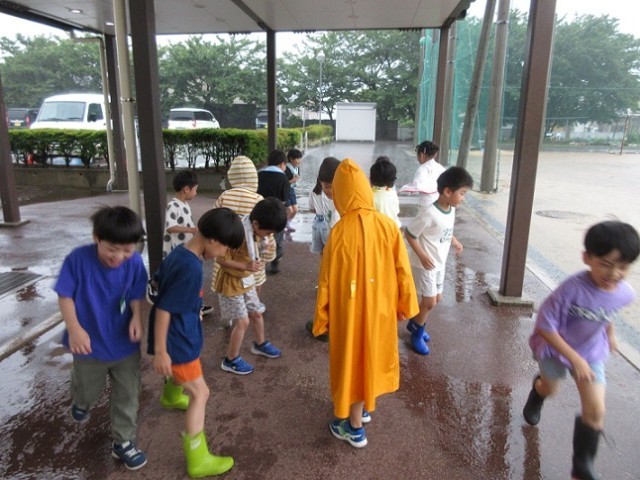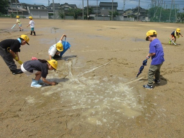 土砂降りになった日、みんなで外に出てみました。雨が屋根に当たる音、傘に当たる音、カッパに当たる音・・いろんな音を楽しみました。グラウンドを川のように流れる様子や雨粒が水たまりに落ちる様子をじっと見ている子供もいました。その後、雲が晴れ、あっという間に青空になり、水たまりでたくさん遊びました。