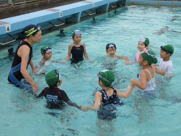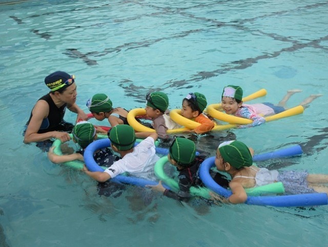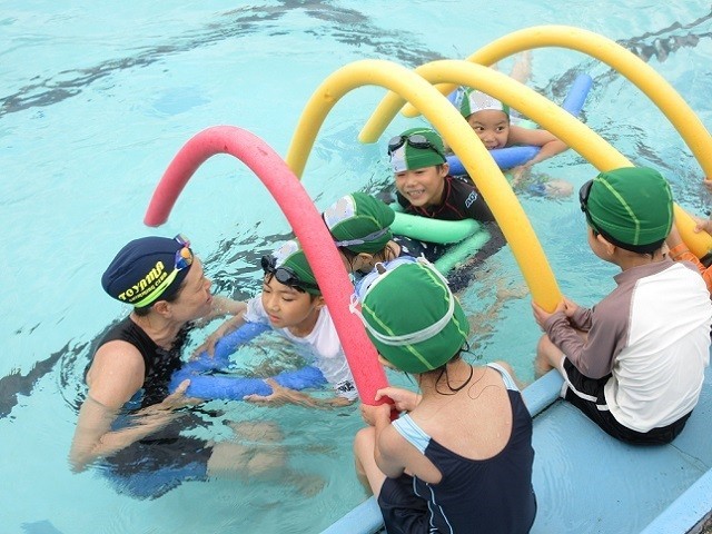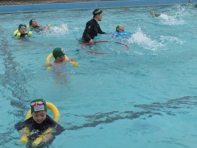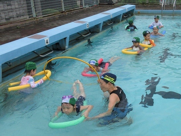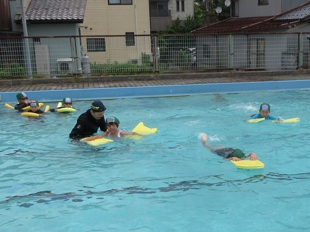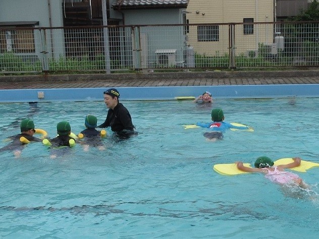 スポーツ指導員の方の指導のもと、水泳教室を行いました。2つのグループに分かれ、いろいろな用具を使いながら、子供たちがひとつでもできることが増えるようにと、教えていただきました。水に顔をつけることができなかった子供たちが、水に浮く楽しさを味わったり、水に潜れる子供たちがバタ足で前に進むおもしろさやラッコのように上向きに浮く気持ちよさを味わったりしました。うまくできずに悔しい思いをする場面もありましたが、みんな最後までやり抜きました。