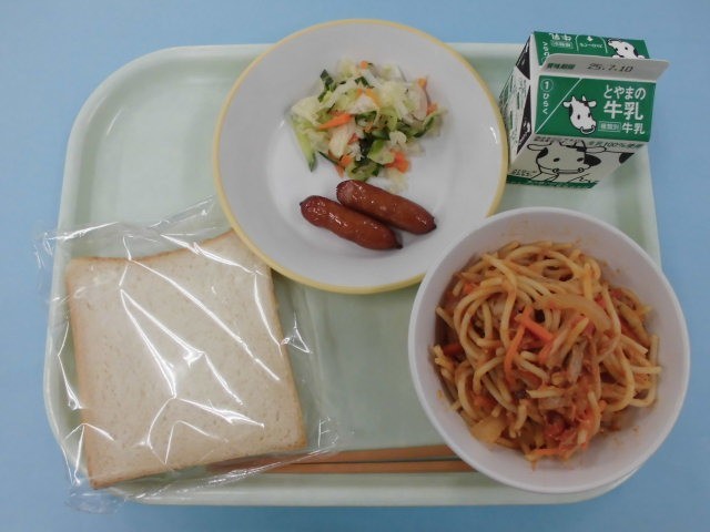 今日の給食は、減量食パン、牛乳、あらびきウインナー、コールスローサラダ、ツナとトマトのスパゲッティです。