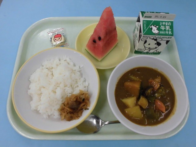 今日の給食は、ごはん、牛乳、夏野菜カレー、福神づけ、すいか、ポケットチーズです。