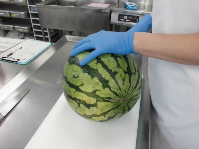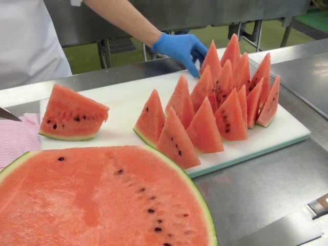 大きなすいか3玉。調理員さんが、丁寧に切り分けてくださいました。