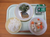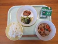 きょうの給食は、ごはん、牛乳、鰊の生姜味、納豆和え、親子煮です。