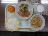今日の献立は、ごはん、牛乳、あげだし豆腐のごまだれがけ、いり大豆あえ、冬瓜のみ...